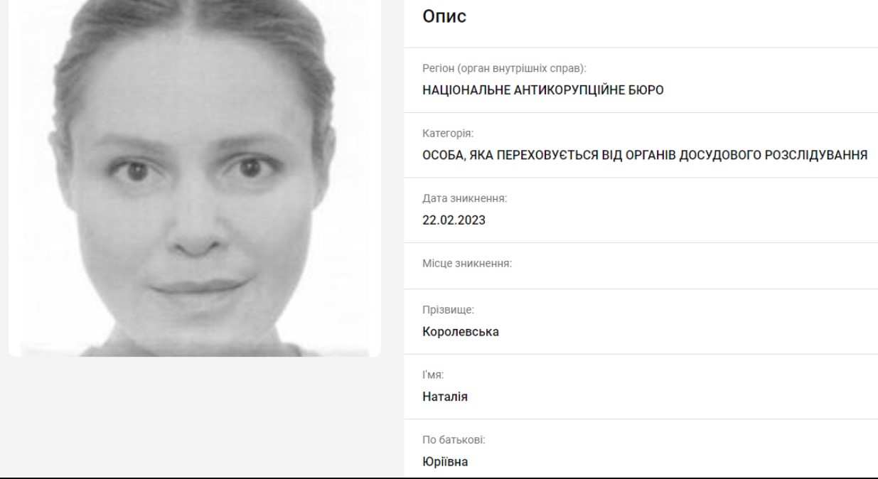 Королевську оголосило в розшук Національне антикорупційне бюро України. Колишню опозиціонерку розшукують через звинувачення в декларуванні недостовірної інформації – це ст. 366-2 Кримінального кодексу України.