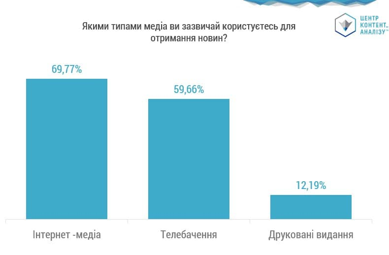 Так, 69,77% опрошенных граждан пользуются Интернетом для получения новостей. Из телевидения черпают информацию почти 60%. В то же время, только 12% граждан ищут новости в печатных СМИ.