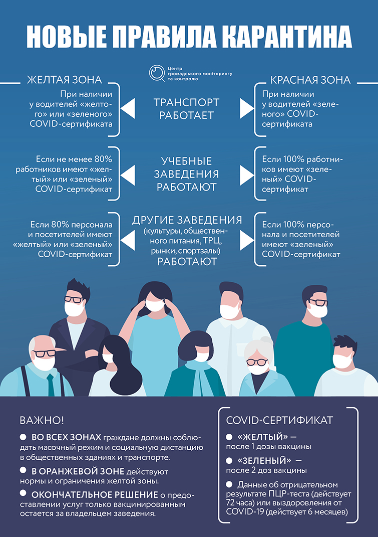 Согласно постановлению, заведения общественного питания, культуры и отдыха, торгово-развлекательные центры, спортзалы и бассейны могут работать дальше в желтой и оранжевой зонах при условии соблюдения масочного режима, социальной дистанции и наличии «желтых» или «зеленых» COVID сертификатов в 80% персонала и посетителей.