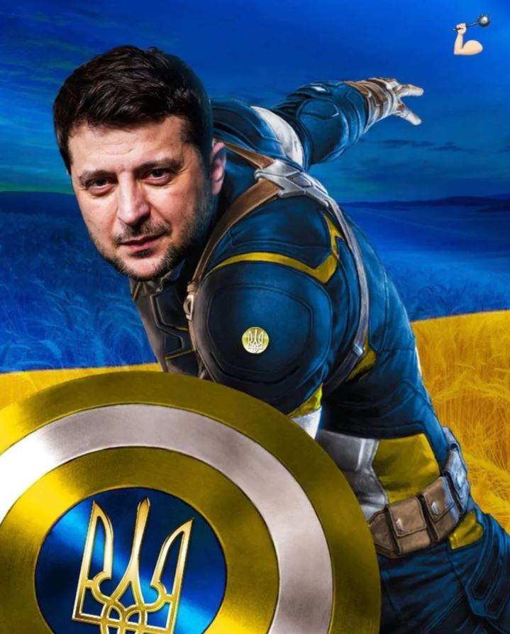 Владимир Зеленский – украинский Капитан Америки, держащий щит с украинским Гербом.
