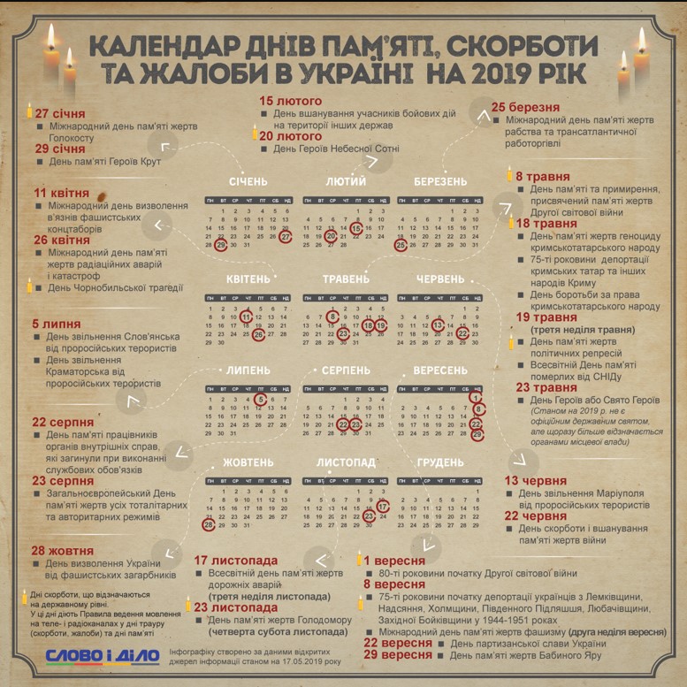 Что касается траурных дней, то они объявляются в связи с какими-то трагическими событиями либо президентом Украины, либо Верховной Радой, либо местными властями.