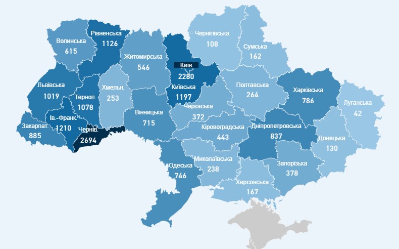 Число заболевших COVID-19 превышает 1000 в семи регионах: в Киеве, Черновицкой, Ивано-Франковской, Тернопольской, Ровенской, Львовской и Киевской областях.