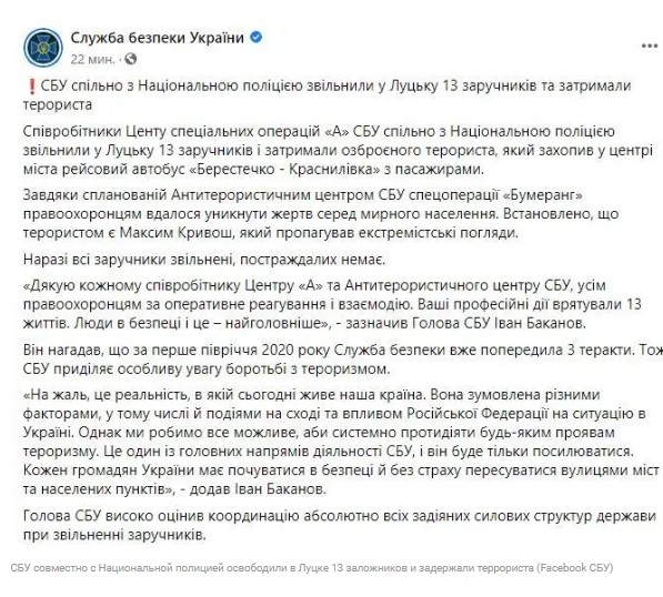 “Благодаря спланированной антитеррористическим центром СБУ спецоперации “Бумеранг” правоохранителям удалось избежать жертв среди мирного населения. Установлено, что террористом является Максим Кривошей, который пропагандировал экстремистские взгляды.