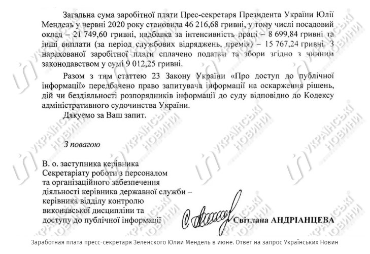 “Сумма заработной платы пресс-секретаря Президента Украины Юлии Мендель в июне 2020 года составляла 46 217 гривен”, – сказано в нем.