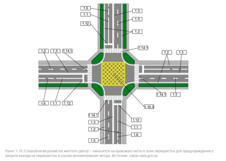 Для чего нужна такая разметка, рассказали в сюжете программы “Джедаи” на канале “2+2”. Напомним, что с 1 ноября в Украине вступили новые Правила дорожного движения. В разделе “Дорожная разметка” есть обозначение одного из нововведений – пункт 1.10.3 (коробчатая разметка желтого цвета) – наносится на проезжую часть в зоне перекрестка для предупреждения о запрете въезда на перекресток в случае возникновения затора (Постановление Кабмина №1091 от 29.09.2021).