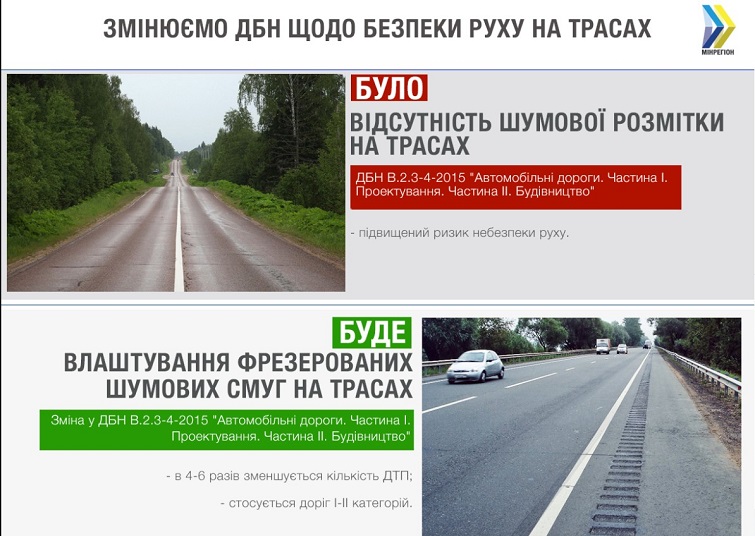 По словам представителя Минрегиона, в Украине такие шумовые полосы будут обустраивать на крупнейших трассах, дорогах первой и второй категорий. А именно на обочинах таких дорог и перед приближением к участку с повышенной опасностью.