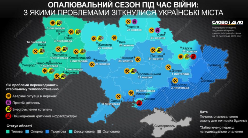 У тилових обласних центрах – Луцьку, Івано-Франківську, Львові, Рівному, Тернополі, Хмельницькому, Чернівцях опалювальний сезон розпочали на початку листопада. Але там теж не все гладко: внаслідок ракетних ударів росії в областях виникають проблеми з електропостачанням, що призводить до аварійного знеструмлення котелень. Таке, зокрема, сталося 15 листопада.