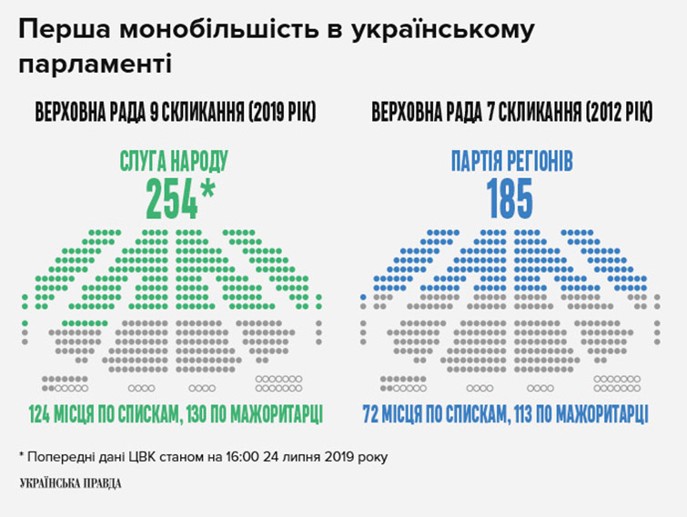 Впервые в истории независимой Украины большинство в Верховной Раде получает одна партия. По состоянию на сейчас “Слуга народа” проводит в Раду 254 народных депутата. После того, как свое монопольное положение в политике потеряла Компартия СССР, сформировать в парламенте монобильшисть не удавалось ни одной партии. Ближайшее к показателю 226 голосов, необходимых для большинства в Раде, приближалась “Партия регионов”, которая в 2012 году имела фракцию в 185 депутатов.