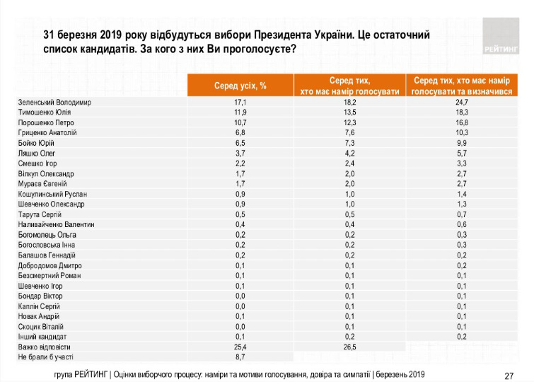 Лидером президентского рейтинга является В.Зеленский, которого поддерживают 24,7% тех, кто определился и намерен голосовать. Вторую позицию занимает Ю.Тимошенко (18,3%), третью – П.Порошенко (16,8%). За А. Гриценко готовы отдать свои голоса 10,3%, Ю.Бойко – 9,9%, О.Ляшко – 5,7%, И.Смешко – 3,3%, А. Вилкула и Е. Мураева – по 2,7%.