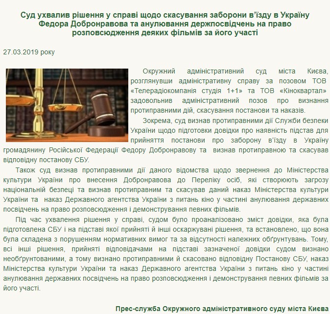 “В частности, суд признал противоправными действия Службы безопасности по подготовке справки о наличии оснований для принятия постановления о запрете на въезд гражданину РФ Федору Добронравову и признал противоправным и отменил соответствующее постановление“, – говорится в сообщении.