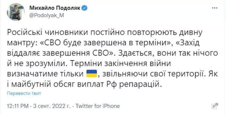 “Російські чиновники постійно повторюють дивну мантру: “СВО буде завершена в терміни”, “Захід віддаляє завершення СВО”. Здається, вони так нічого й не зрозуміли. Терміни закінчення війни визначатиме тільки Україна, звільняючи свої території”, – написав Подоляк.