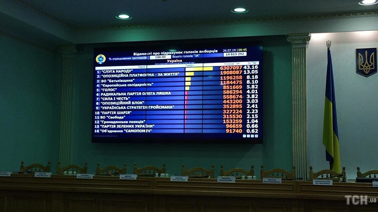 Партия “Слуга народа” получила 43,16% голосов, “Оппозиционная платформа – За жизнь” – 13,05%, “Батькивщина” – 8,18%, “Европейская солидарность” – 8,10%, а “Голос” – 5, 82%.