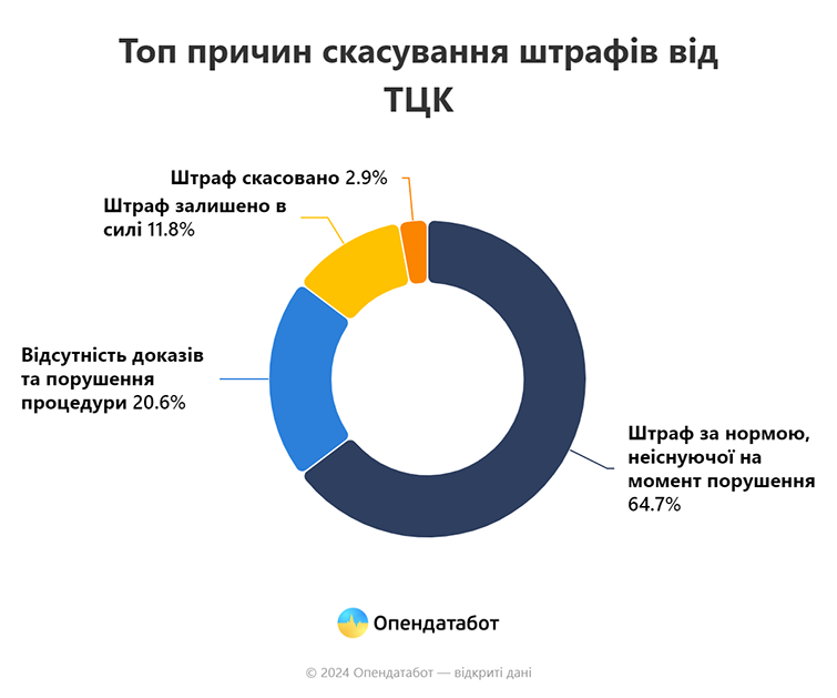 У 20% штрафи оскаржені через порушення процедури притягнення до відповідальності або відсутність доказів вчинення правопорушення. Так, наприклад, оскаржили штраф за неперебування на військовому обліку у РТЦК чоловіка, який за два тижні до того отримав тимчасове посвідчення про взяття на військовий облік.
