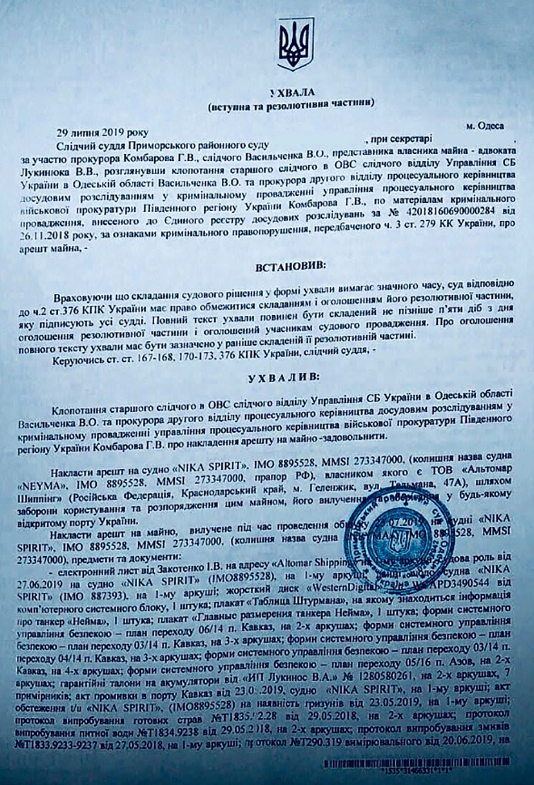 “Українським судом перевірено правомірність дій військових прокурорів та слідчих СБУ, а також дотримання ними вимог закону під час проведення 25.07.2019 обшуку вже всім відомого російського танкеру «NEYMA», який блокував українські військові кораблі у Керченській протоці.