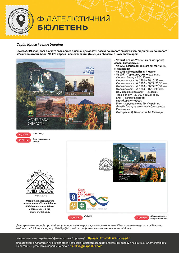 Укрпошта презентує поштовий блок та марку серії «Краса і велич України. Донецька область». Випуск приурочений до 5-ої річниці звільнення міст Донецької та Луганської областей. Спецпогашення марок відбулося 5 липня у м. Києві в Лівобережному поштамті та у м. Слов’янську.