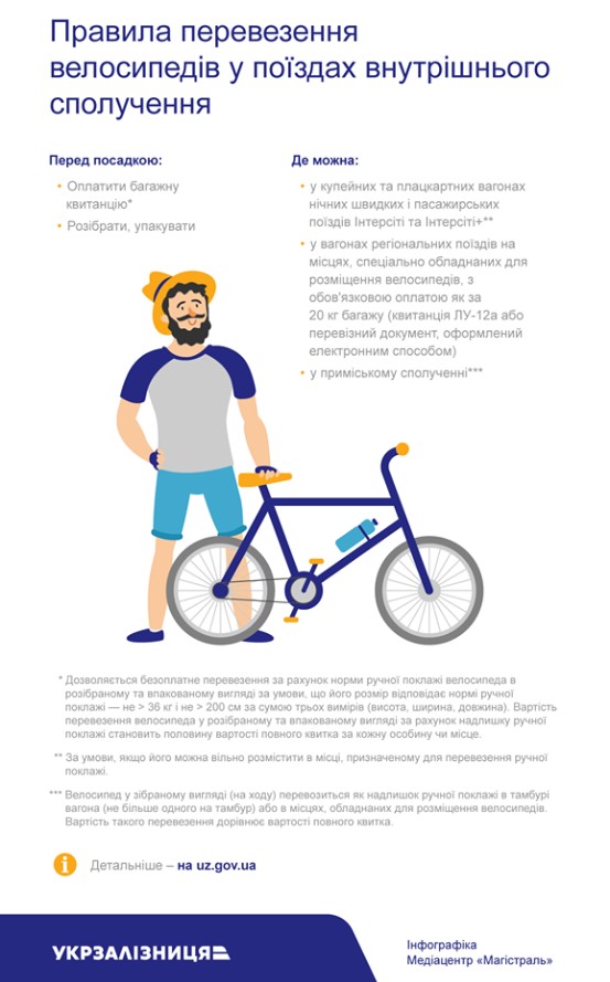 Как уточнили в УЗ, согласно обновленным правилам, перевозка велосипедов в разобранном и упакованном виде разрешена в плацкартных или купейных вагонах, а также поездах “Интерсити” и “Интерсити+”.