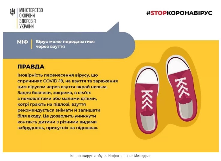 “Очередной миф, который распространился из-за отсутствия правдивых данных: коронавирус передается через обувь. Но обувь не контактирует с дыхательными путями, поэтому сняв ее и помыв руки, можно не беспокоиться о заражении”, – сказано в сообщении.