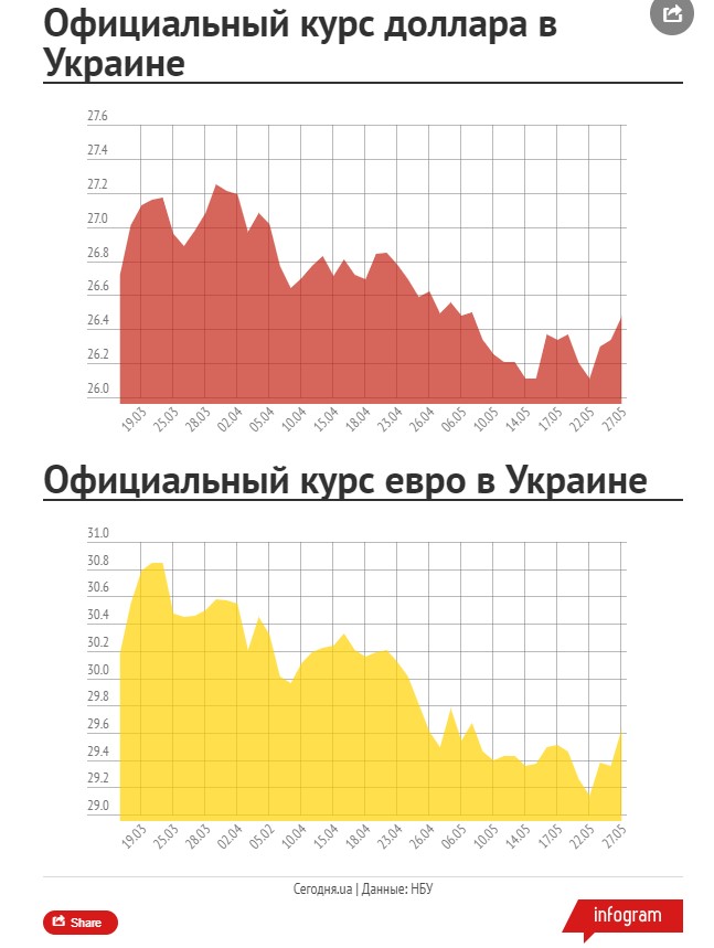 На сегодня, 27 мая, Национальный банк Украины (НБУ) установил такие курсы основных иностранных валют к гривне:
