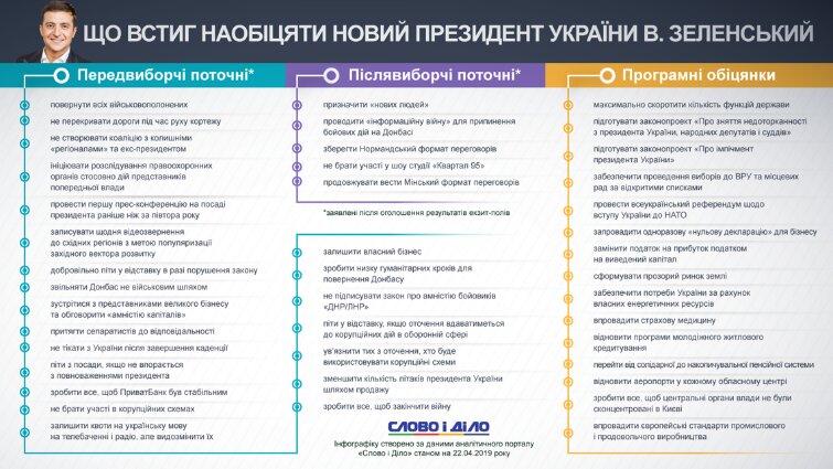 Владимир Зеленский, который побеждает на выборах президента Украины, за время предвыборной кампании давал определенные обещания. Журналисты аналитического портала  «Слово и дело» собрали обещания, которые есть в программе кандидата в президенты, которые давались после оглашения экзитпола, обещания, которые давал Владимир Зеленский в ходе избирательной компании.