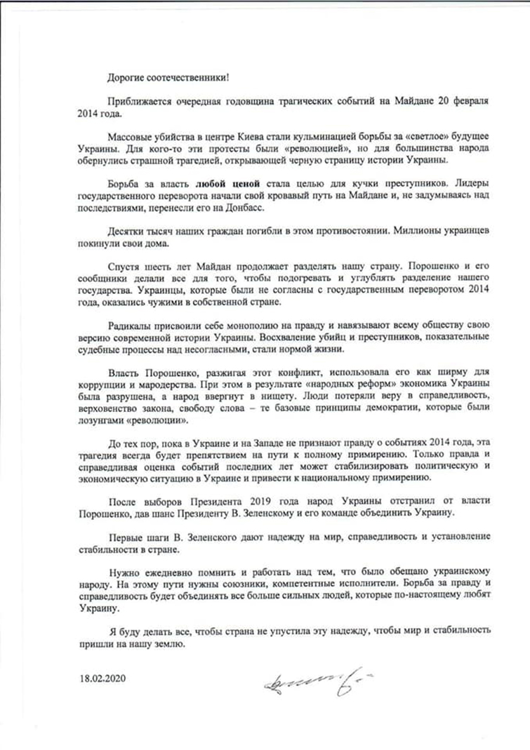 Бывший президент Украины Виктор Янукович в шестую годовщину расстрелов на Майдане написал обращение, в котором выразил надежду, что президент Владимир Зеленский сможет “объединить страну”, и заявил о готовности помочь ему.