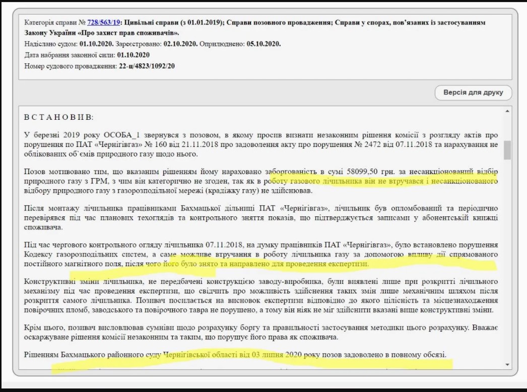 Согласно материалам дела, проверяющим показалось, что, несмотря на целые пломбы, показания занижали – мол, на счетчик установили магнит. Тогда счетчик сняли и отправили на экспертизу. Там сделали вывод: виновен, и насчитали долг в размере почти 60 тыс. грн.