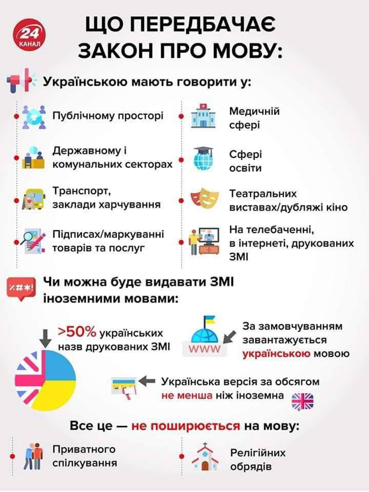 Где будут говорить на украинском? В публичном пространстве, государственном и коммунальных секторах, в сфере обслуживания, в подписях и маркировке товаров и услуг. В театральных спектаклях и при дубляже кинофильмов. На телевидении, в интернете и печатных СМИ. Везде. Предполагается, что государство гарантирует право на получение образования на государственном языке.