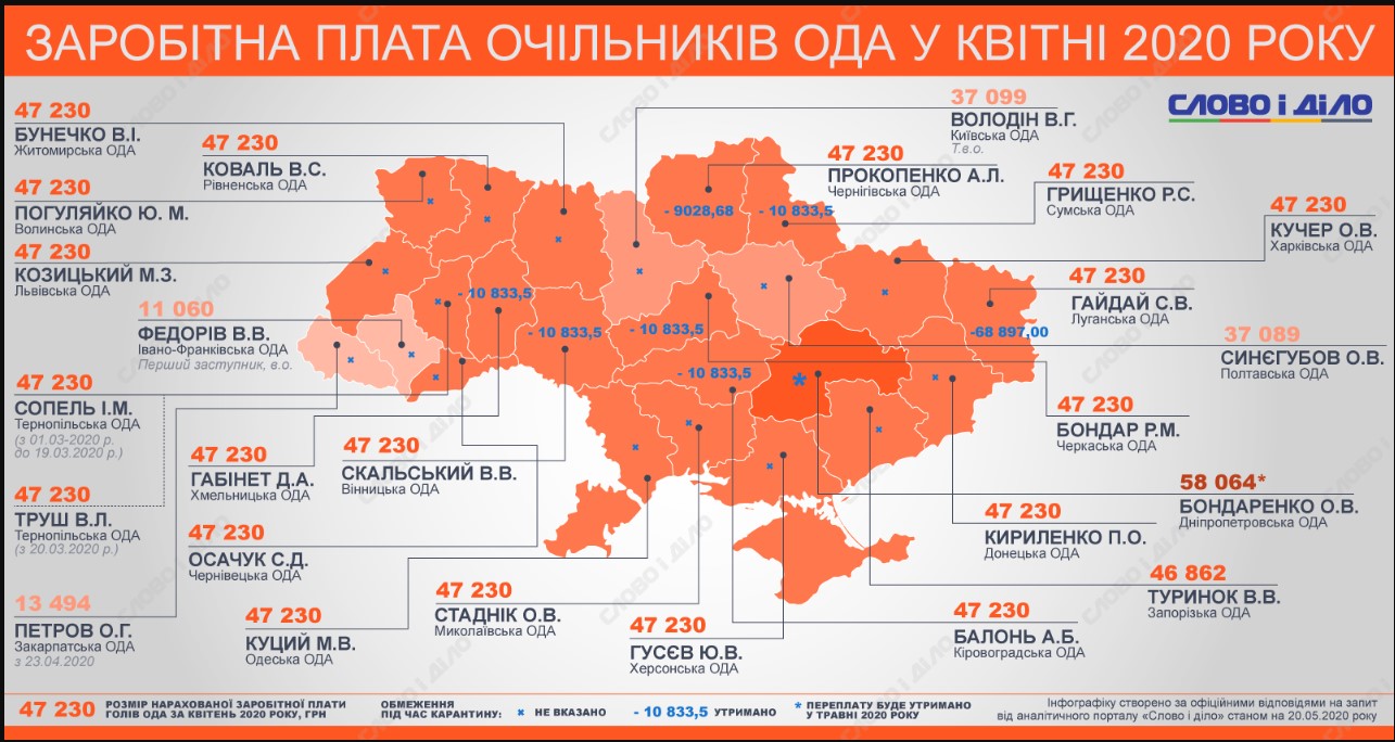 Из-за карантина зарплаты висопоставленных чиновников в апреле стали значительно меньше, чем в марте, когда некоторые главы областных госадминистраций получили по 60-80 тысяч гривен. «Слово и дело» предлагает посмотреть, какие зарплаты насчитали в прошлом месяце главам областных администраций.