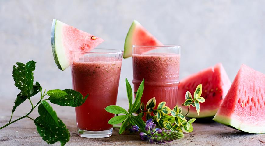 Отрежьте у арбуза корки вместе с белой частью, удалите все косточки. Нарежьте арбуз средними кусками, сложите в блендер.