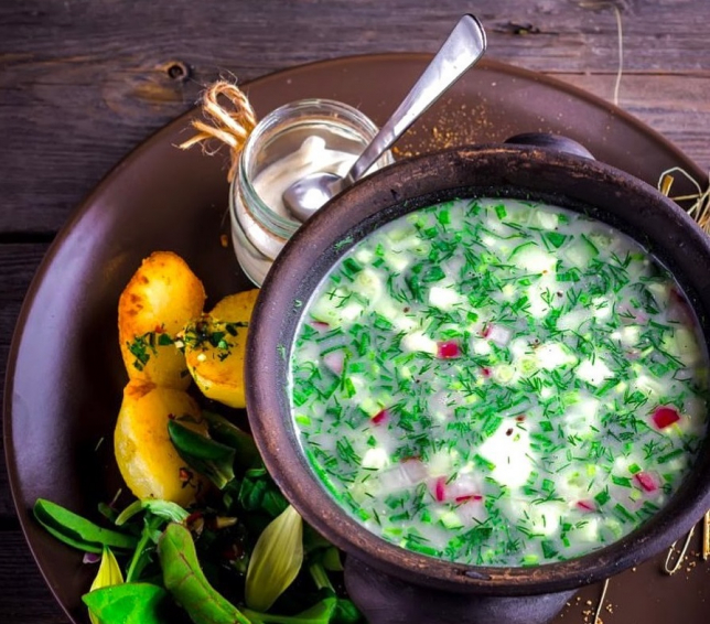 - Выложить в щавелевый отвар овощи, зелень, яйцо и мясо, перемешать, добавить сметану.