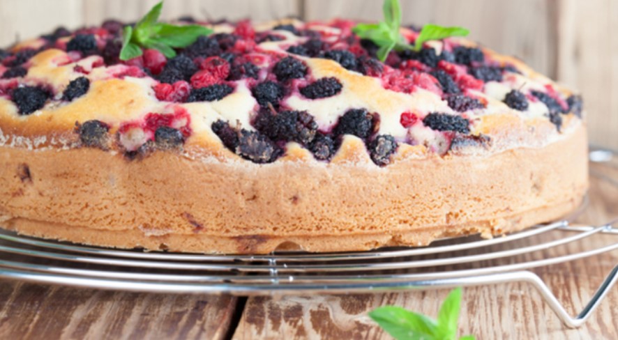 - Форму застелить бумагой для выпечки, вылить половину теста, сверху выложить шелковицу и присыпать ее сахарной пудрой (можно сахаром).