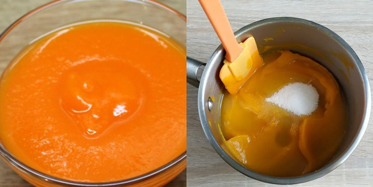 - Тыкву немного остудите и измельчите блендером до однородной массы без комочков, добавьте лимонный сок и сахар. Перелейте тыквенное пюре снова в кастрюлю, поставьте на небольшой огонь и проварите 1 минуту. Всыпьте агар-агар, перемешайте и прокипятите еще минуту, постоянно помешивая.