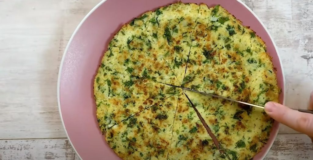 При помощи плоского блюда переворачиваем запеканку и обжариваем еще 5 – 7 минут.