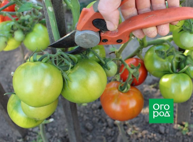 - Срезать верхушки всех побегов, оставив несколько листьев над кистью с созревающими плодами.