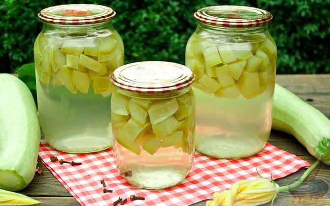 Ингредиенты: кабачки (1-2 шт.), вода (2 л), сахар (2 стакана), уксус 6% (0,5 ч. л.), гвоздика(2-3 палочки).