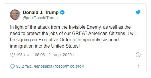 Прямая речь: “В свете нападения невидимого врага, а также необходимости защитить рабочие места наших великих американских граждан, я подпишу указ о временном приостановлении иммиграции в Соединенные Штаты!”.