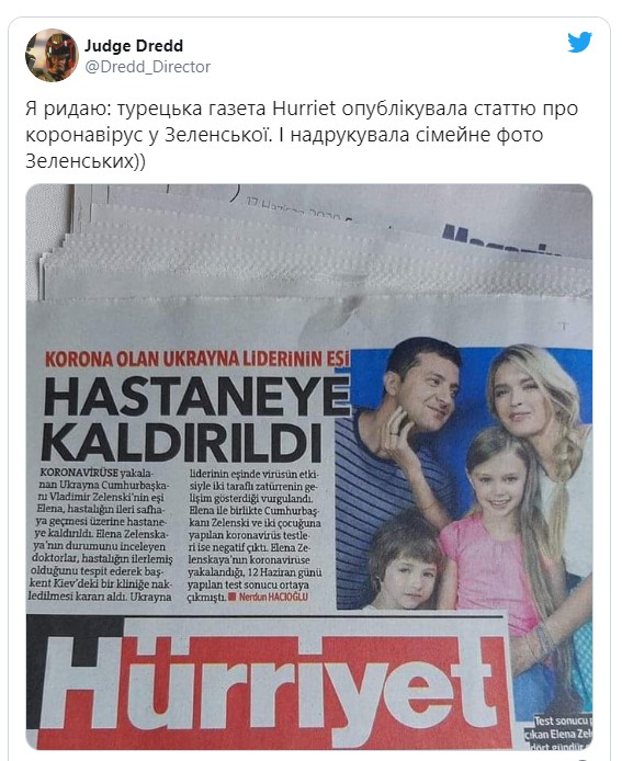 В турецкой ежедневной газете Hürriyet появилась публикация об обнаружении COVID-19 у жены Президента Украины Елены Зеленскоой с фотографией Владимира Зеленского с артисткой Верой Брежневой.
