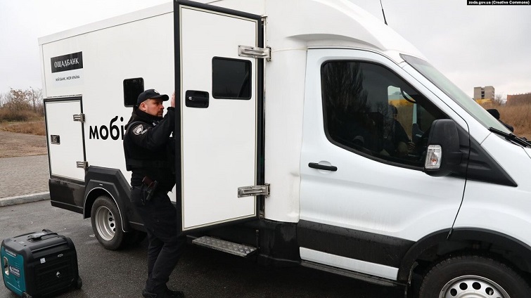 Щоб допомогти мешканцям прифронтових територій, «Ощадбанк» організував мобільне відділення на колесах. Воно доставляє готівку на саму лінію фронту у броньованому автомобілі. Зовні це звичайний мікроавтобус, але всередині у нього броньована капсула та броньоване скло. Масивні двері закриваються на сталеві засуви, а цінний вантаж супроводжує охорона з двох поліцейських.