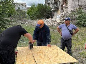 У Лимані після обстрілу розчищали територію біля пошкодженого будинку та закривали вікна плитами
